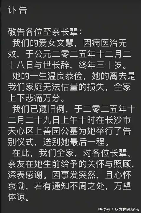 2025年12月的尾巴,大家都在盼望新年的时候,一则让人心碎的讣告从湖南长沙传出:30岁的文慧因为病情抢救无效,于12月28日永远告别了这个世界。这位刚刚沉浸在婚姻幸福中的姑娘,在亲友心中一直是温柔善良、笑容满面的“赛西施”,却以这么突然的方式,为自己的人生画上了句点,留下了无尽的悲伤和惋惜。